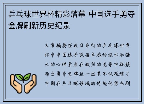 阅读文章摘要:2025年世界锦标赛在激烈的角逐中迎来了许多亮点,中国队在这场赛事中表现非凡,不仅在多个项目中斩获佳绩,还创造了多项世界纪录,刷新了各项赛制历史。这一赛事的精彩之处,除了中国队的卓越表现外,...