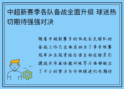 阅读随着中超联赛进入下半程,各支球队为了争夺季后赛资格展开了激烈的角逐。随着竞争的不断升温,强强对决的局面也愈加白热化。对于中超的各大强队来说,不仅要在赛场上不断提升实力,还需在战术安排、队员状态和心理层...